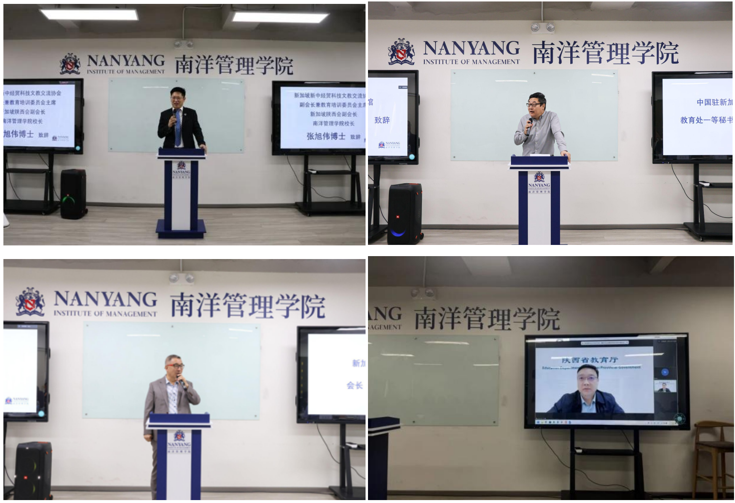 研讨会在热烈的氛围中拉开帷幕。中国驻新加坡大使馆教育处一等秘书王勇先生、新加坡陕西商会会长王刚先生、陕西省教育厅国际处文通处长,以及南洋管理学院校长张旭伟博士先后致辞。他们高度评价了中新两地教育合作的历史成果,并展望了未来合作的美好前景。